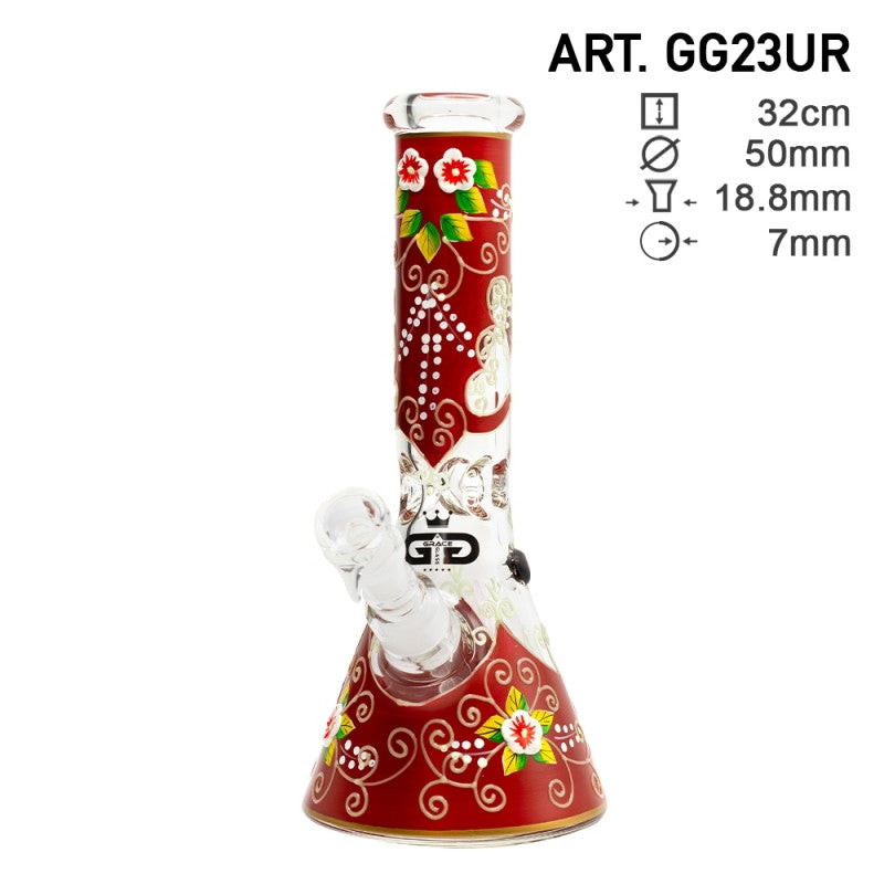 The Grace Glass Glowing Beaker Red Bong is a striking and functional water pipe designed for both aesthetic appeal and a smooth smoking experience. Standing at 32 cm tall, this bong features a classic beaker base for stability and a spacious water chamber. The 18.8 mm joint size accommodates standard accessories, and the ice notches allow for the addition of ice cubes to cool the smoke further. Crafted from 7 mm thick borosilicate glass, it offers durability and heat resistance.